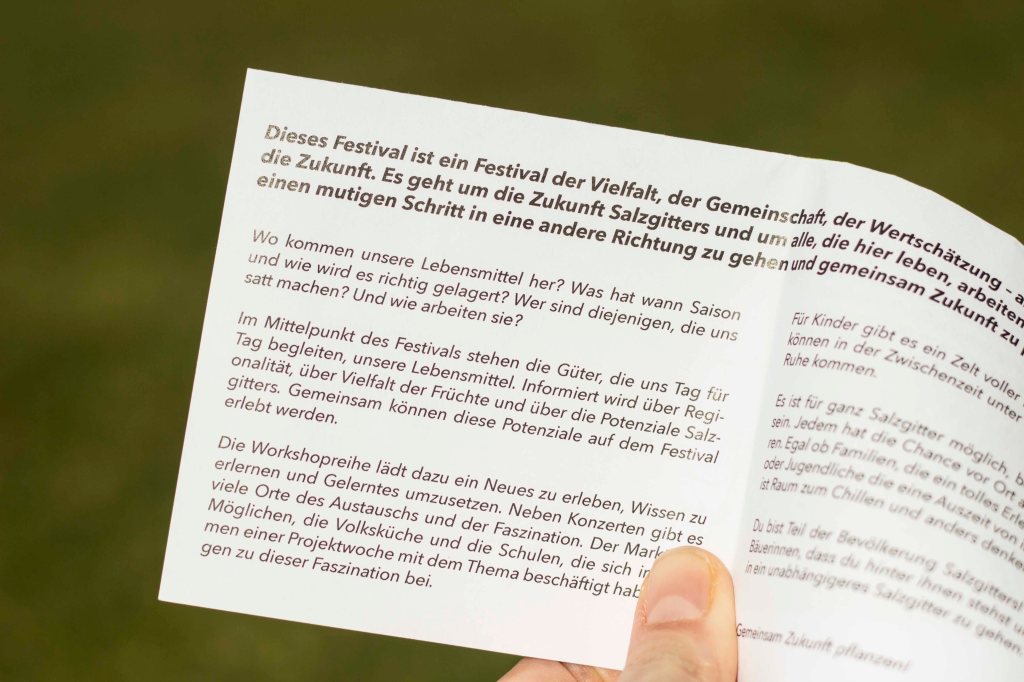 Wir schreiben das Jahr 2020. Viele deutsche Böden werden durch die intensive Landwirtschaft immer unfruchtbarer. Die Stadt Salzgitter hat bereits 2017 begonnen diesem Trend entgegen zu wirken. Die Böden werden naturnah bewirtschaftet. Mit Hilfe von einer langfristig gedachten Anbauweise, wie der Permakultur oder dem Waldgarten werden hochwertige Biolebensmittel gewonnen. Des Weiteren wird die Abwärme der Industrie genutzt, um Gewächshauser zu beheizen. Lebensmittel wie Bananen oder Kaffee können dadurch auch vor Ort angebaut werden. Salzgitter ist die Stadt mit der größten Biodiversität deutschlands und bietet vielen Arten ein zu Hause. Das Projekt zeichnet sich durch kurze Transportwege aus und versorgt nicht nur sich selbst, sondern auch Braunschweig, Goslar und Wolfenbüttel mit frischen Lebensmitteln. Durch den regionalen Warentransport und die naturnahe Anbauweise sind viele lokale Arbeitsplätze entstanden und das Landleben genießt eine hohe Attraktivität.